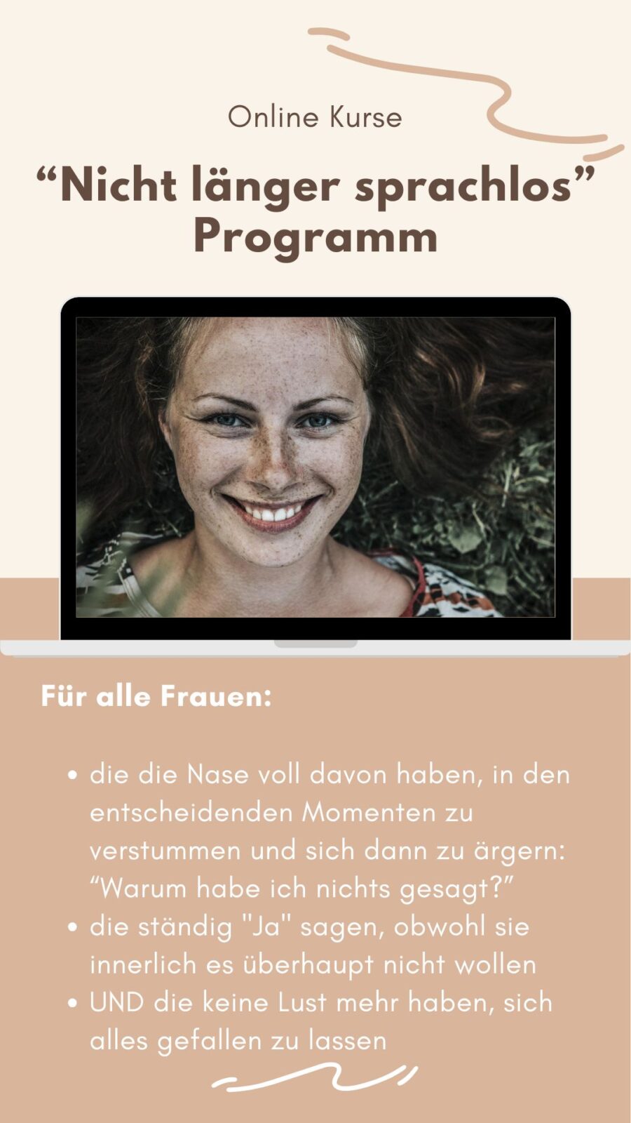Im „Nicht länger sprachlos“ Programm geht es nicht darum, jemand anders zu werden. Es geht darum, dass du wieder Zugang zu deiner eigenen Klarheit, deiner inneren Ruhe und deiner natürlichen Stärke bekommst – ohne dich dabei zu verurteilen oder schlecht zu fühlen, nur weil du „Nein“ gesagt hast.